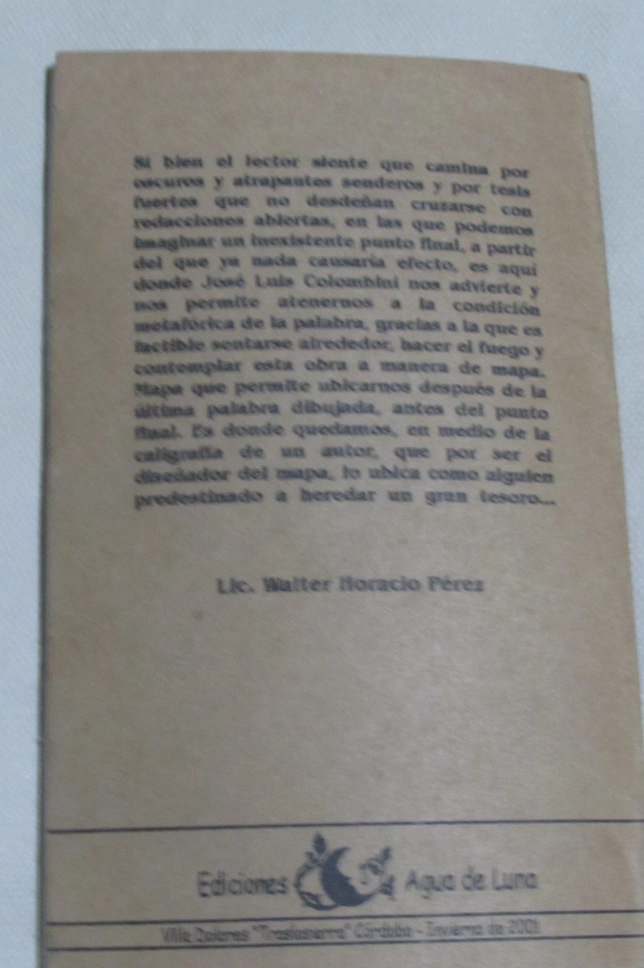 Si bien el lector siente que camina por oscuros y atrapantes senderos y por tesis fuertes que no desdeñan cruzarse con redacciones abiertas, en las que podemos imaginar un inexistente punto final, a partir del que ya nada causaría efecto, es aquí donde José Luis Colombini nos advierte y nos permite atenernos a la condición metafórica de la palabra, gracias a la que es factible sentarse alrededor, hacer el fuego y contemplar esta obra a manera de mapa. Mapa que permite ubicarnos después de la última palabra dibujada, antes del punto final. Es donde quedamos, en medio de la caligrafía de un autor, que por ser el diseñador del mapa, lo ubica como alguien predestinado a heredar un gran tesoro...